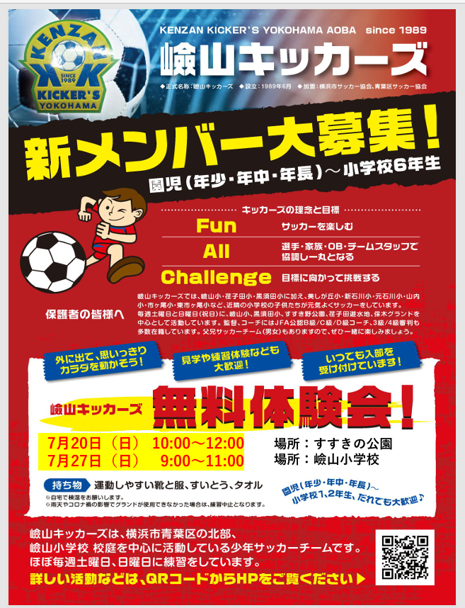 嶮山キッカーズ サッカー体験会開催!!のお知らせ